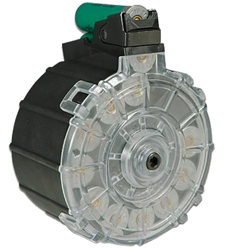 This 12-round drum magazine is designed for the Saiga 12-gauge semi-automatic shotgun and accommodates 2.75-inch shells. Constructed from high-impact black polymer with steel reinforcement inserts, the drum measures approximately 5 inches in overall diameter and features a durable, reliable design for repeated use.