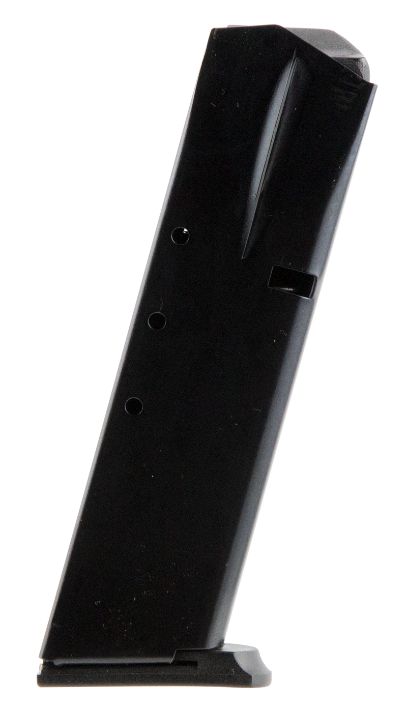 This ProMag SCYA1 is a 15-round extended magazine chambered in 9mm Luger, designed to fit SCCY CPX-1 and CPX-2 pistols. The magazine body is constructed of heat-treated steel with a black oxide blued finish, featuring an injection-molded follower and heat-treated chrome silicone wire spring. Made in USA.