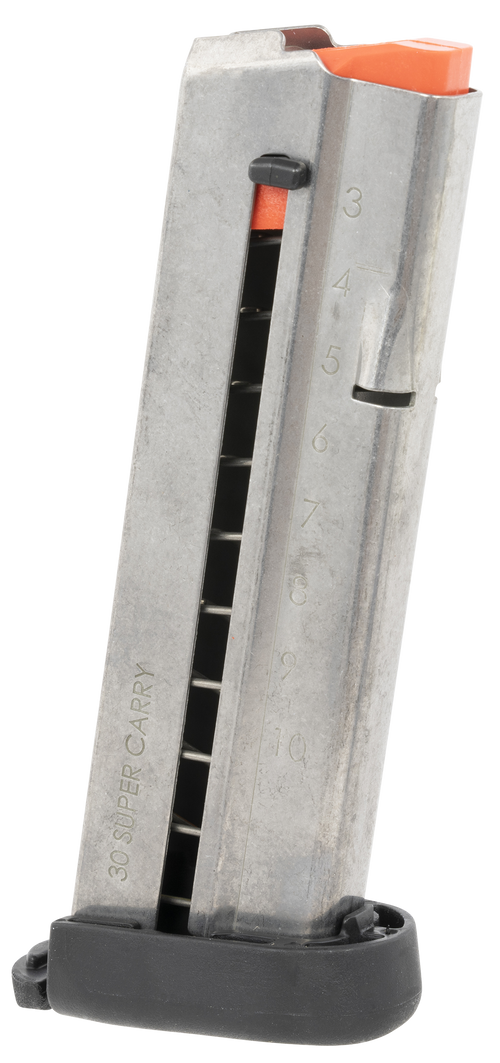10-round magazine designed for Smith & Wesson Shield EZ pistols chambered in .30 Super Carry. Constructed from 4140 heat-treated steel with black oxide finish and features an injection-molded follower and heat-treated chrome silicone wire spring. Made in the USA.