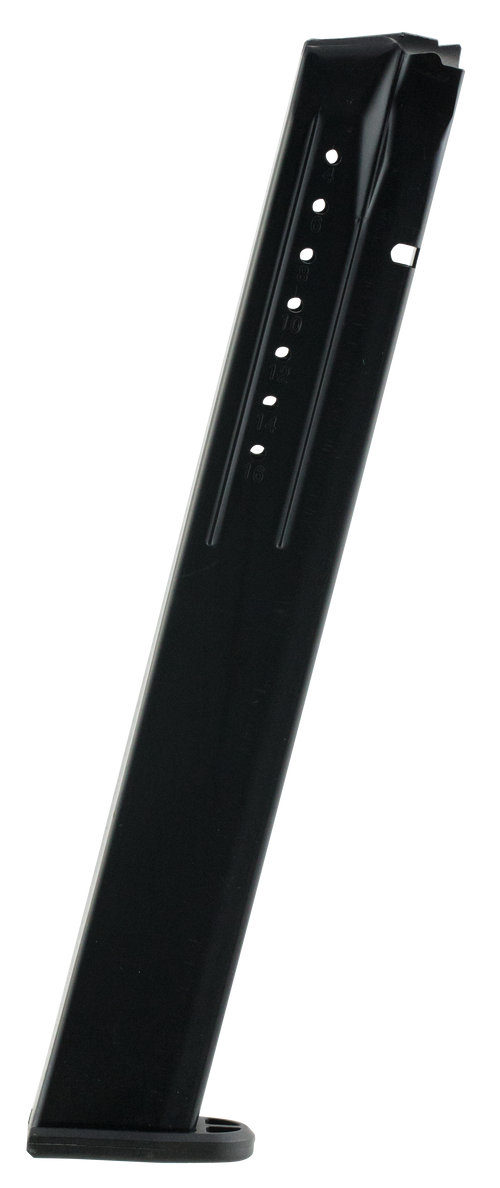 32-round magazine designed for Smith & Wesson SD9 9mm pistols. Constructed of heat-treated steel with black oxide blued finish, injection-molded magazine follower, and heat-treated chrome silicone wire spring. Made in USA.