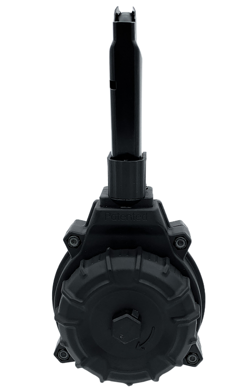 30-round drum magazine designed for Smith & Wesson Shield Plus 9mm pistols. Features a proprietary DuPont Zytel polymer body with blue steel upper tower, injection molded follower, and heat-treated stainless steel spring. Made in USA.