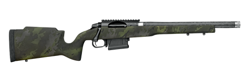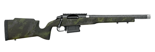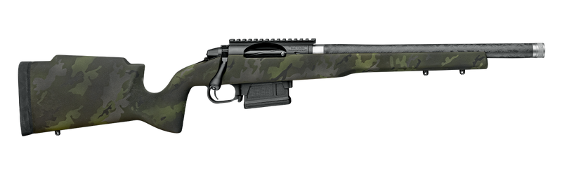 The Elevation MTR 2.0 is a 300 PRC bolt-action rifle featuring a 20" match-grade CF-wrapped barrel with 1-in-9 twist and threaded 5/8x24 muzzle. Built on a Zermatt Arms Origin action with a carbon fiber midnight camo stock, it weighs 7 lbs 2 oz and includes a Sub-MOA accuracy guarantee. The stainless steel finish and modern ergonomics make this a precision-focused hunting and long-range platform.