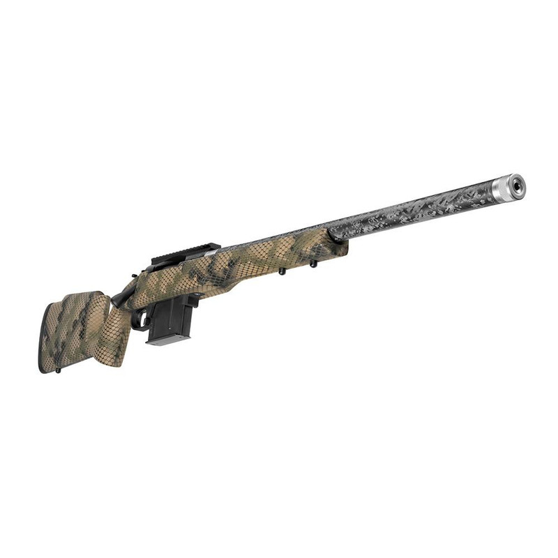 The Elevation MTR 2.0 is a bolt-action rifle chambered in 6.5 PRC with a 22" threaded carbon fiber-wrapped match-grade barrel and 5-round detachable box magazine. It features a lightweight carbon fiber stock in TFDE, Zermatt Arms Origin action, TriggerTech trigger, and Picatinny rail for optics mounting, backed by a sub-MOA accuracy guarantee. Weight is 6 lbs 7 oz.