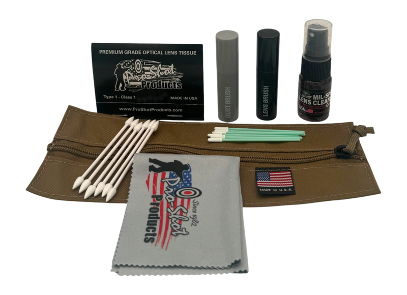 This lens cleaning kit from Pro-Shot Products is designed for maintaining optical clarity on rifle scopes and other precision optics. The kit comes in a tactical pouch for convenient storage and field use. Includes essential lens cleaning materials to remove dust, debris, and residue from glass surfaces.