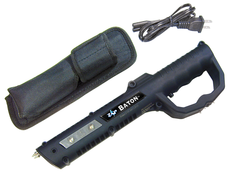 The PSP Zap Stun Baton delivers 1,000,000 volts with four shock contact points (tip, both sides, and handle) to temporarily disable attackers. It features a rechargeable Ni-MH battery, integrated LED flashlight, soft rubber grip coating, and includes a recharging cord. The device has an on/off safety switch and measures 16.8" in length.