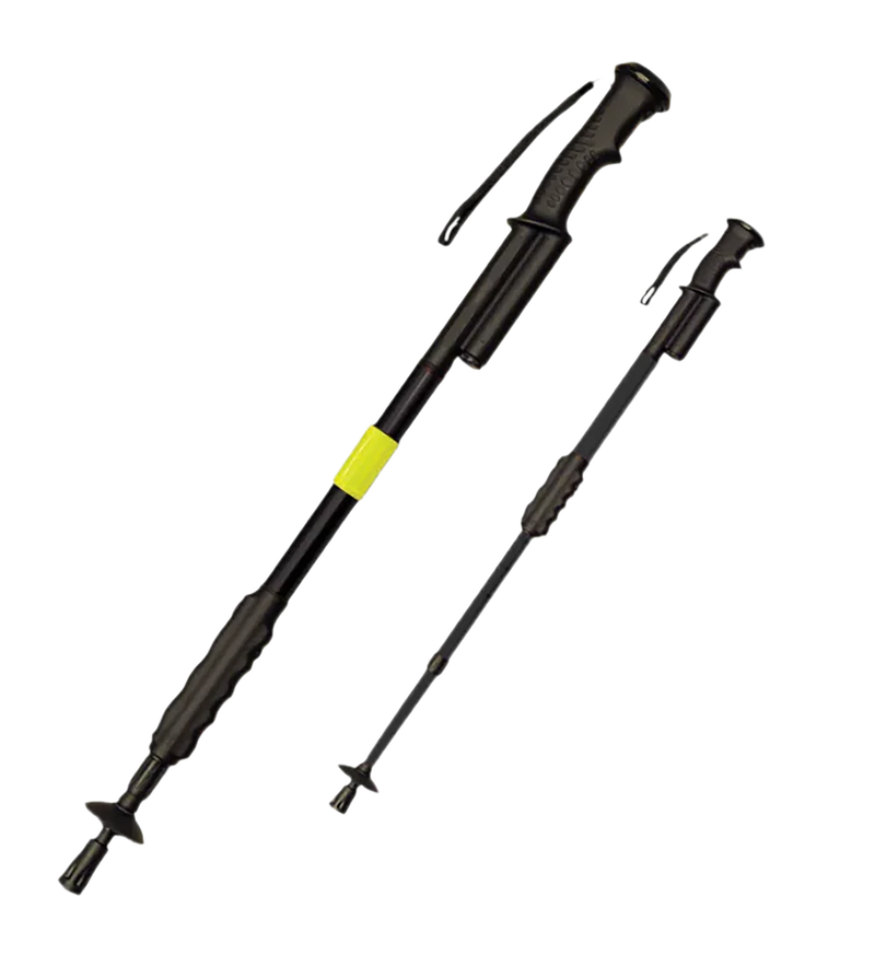 The PSP Zap Hike 'N Strike is a 950,000-volt stun gun constructed from black aluminum, designed for personal protection during outdoor activities. It measures 34.2" in length and includes a removable reflective safety band for visibility and convenience. This self-defense device weighs 18 oz and is intended to repel attackers.