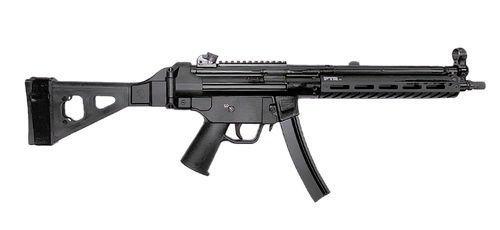 The PTR 9RS BR is a 9mm Luger semi-automatic pistol with a 6-inch black nitride threaded barrel and 30+1 capacity. Features include an M-LOK handguard, Picatinny rail receiver, SB Tactical brace, and black polymer grip. Overall length is 49.5 inches with a width of 12.5 inches.