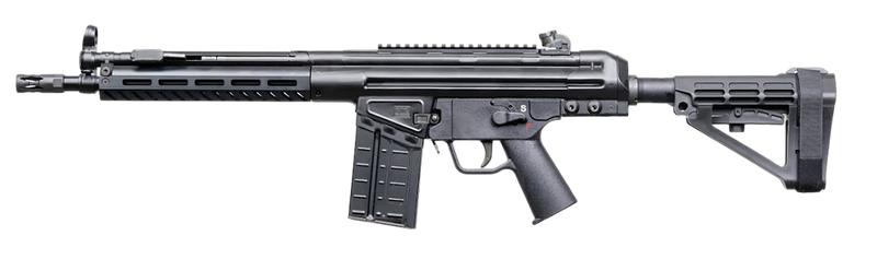.308 Win semi-auto pistol with 12.5" barrel and M-LOK handguard. Features a stabilizing brace for one-handed shooting and picatinny rail compatibility. Compact platform suitable for close-quarters applications.