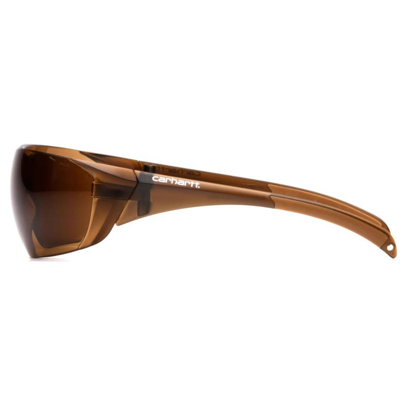 Lightweight frameless shooting glasses with wrap-around lens coverage designed for superior eye protection at the range. Features a bronze-tinted lens for visibility in various lighting conditions. Includes a Carhartt carrying bag for protection and portability.