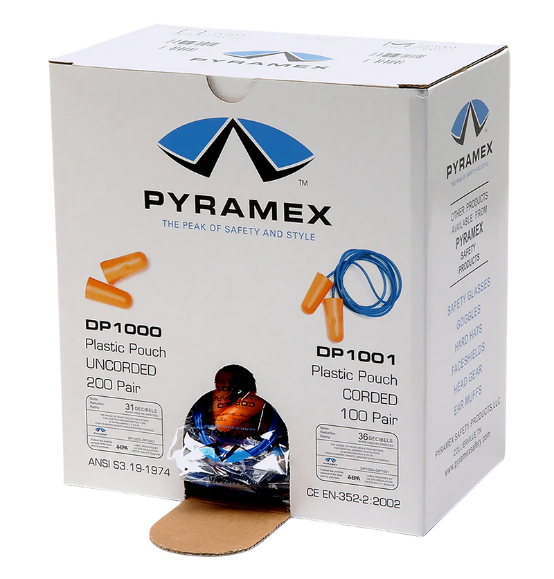 Pyramex DP1000 foam earplugs offer 32 dB noise reduction rating (NRR) for hearing protection in shooting and industrial environments. These in-the-ear style earplugs are made from soft foam material for comfort during extended wear. Each pack contains 200 pairs of orange earplugs.