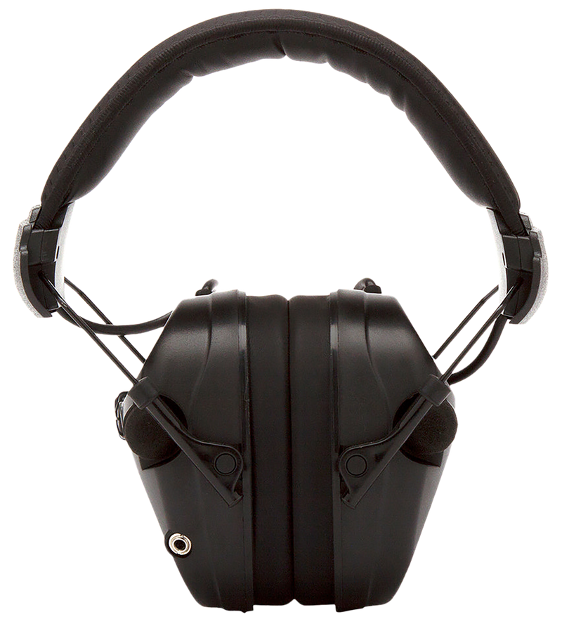 Electronic earmuff with 26 dB NRR that amplifies ambient sound while compressing harmful noise to safe levels. Features adjustable headband, slim profile ear cups, 3.5mm AUX jack for audio devices, and auto shut-off after 4 hours. Includes two AAA batteries.