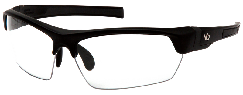 Half-frame shooting glasses with clear polycarbonate lenses featuring anti-fog and anti-scratch coatings for reliable performance at the range. UV protection rated at 99% with adjustable rubber nose piece for secure fit. Available as a single pair with black frame.