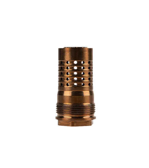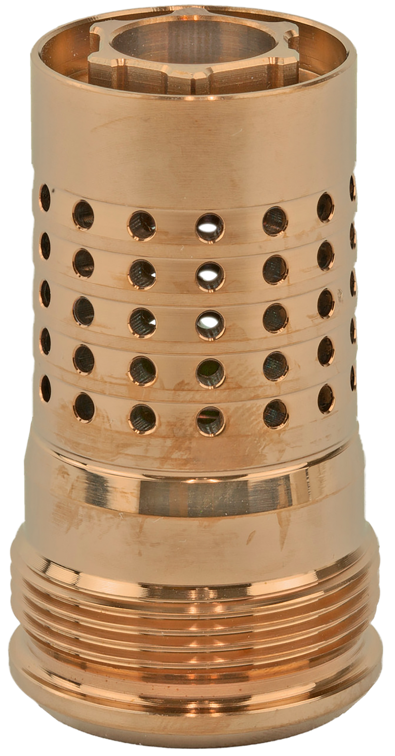 The Cherry Bomb is a muzzle brake designed for 9mm firearms with 1/2x28 thread pitch, constructed from 17-4 stainless steel. It features Q's taper mount shoulder for compatibility with Thunder Chicken and Trash Panda silencers, with 360° circumferential ports that eliminate the need for timing and shims. The brake uses a standard 1/2 inch socket for easy installation and removal.