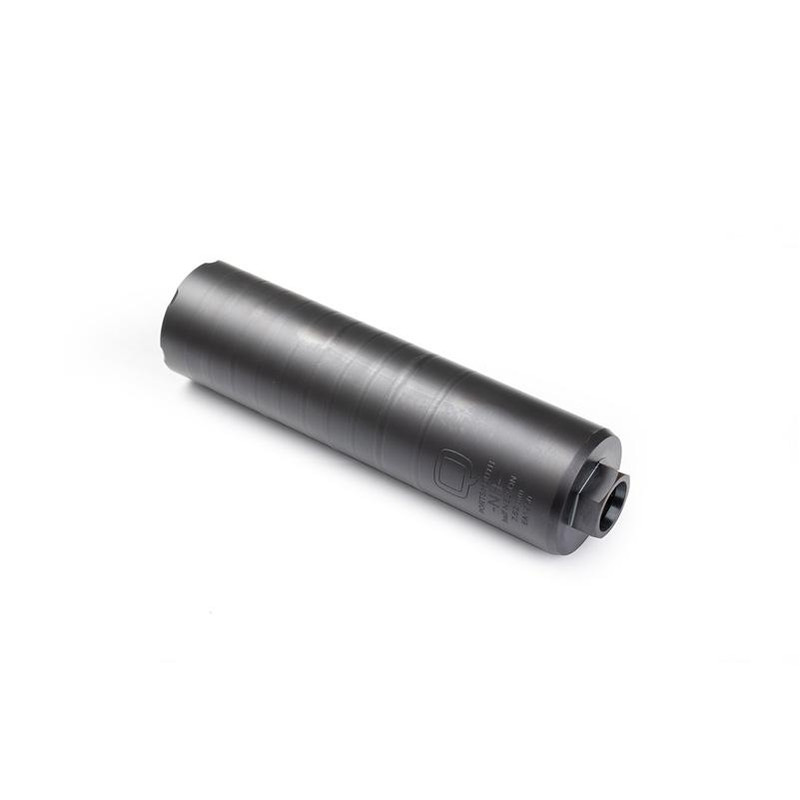 The Q Half Nelson is a compact, lightweight 7.62mm rifle suppressor constructed from 100% titanium with a bead-blasted finish. Featuring direct thread attachment (5/8x24), it measures 6.85" in length and 1.75" in diameter, with a fully welded design and no outer tube for increased internal volume. This multi-caliber rated suppressor is full-auto rated and compatible with 90° shouldered barrels.