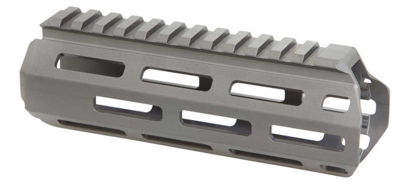 This is a 6-inch M-LOK handguard designed for Q Honey Badger and compatible AR upper receivers. Made from aluminum with a clear anodized gray finish, it features M-LOK slots for accessory mounting and includes a free-floating design for improved accuracy. The Q barrel nut and installation hardware are sold separately.