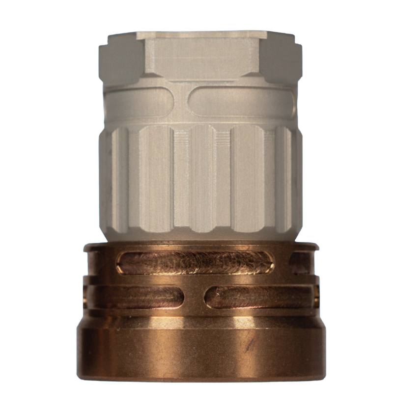 The Erect9r Three-Way Mount is a 9mm tri-lug accessory mount constructed from aluminum and stainless steel with clear hardcoat anodized finish. This mount measures 3.8" in length, 3.5" in width, and 1.5" in height, providing a compact interface for tri-lug compatible suppressors and muzzle devices. Installation is direct via tri-lug mounting system for quick-detach attachment.