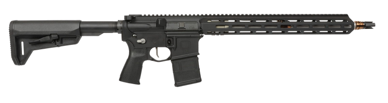 Semi-automatic direct impingement rifle chambered in 5.56 NATO with a 16" threaded barrel featuring a 1:7 twist rate and Cherry Bomb muzzle brake. Built on an M16 spec receiver with a 15" free-floated M-LOK handguard, Magpul SL-K stock, and adjustable gas block, weighing 6.2 lbs. Optic-ready with Picatinny rail and designed to work suppressed out of the box.