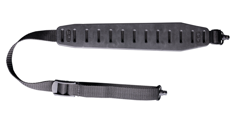 The Quake Claw 2.0 Flush Cup Sling is a 2-point rifle sling featuring a non-slip molded pad incorporated into nylon/rubber webbing that provides approximately 1/2 inch of stretch to distribute firearm weight across the shoulder for increased comfort. The sling includes quick-detach flush cup swivels and measures 16.8 inches in length with a 2.6-inch width. The durable, odor-resistant pad design keeps the firearm secure in place while eliminating tugging, rolling, and pulling.