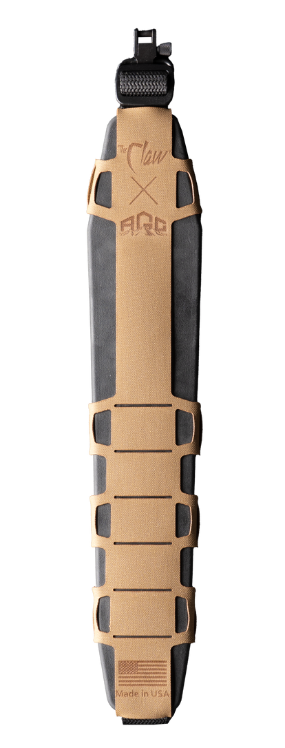 The Claw 2.0 is a rifle sling featuring a molded, odor-resistant pad that distributes weight evenly and remains flexible to -40°F. The laser-cut 500D nylon Molle panel allows mounting of accessories like rangefinders and ammo pouches, while Hush Stalker II metal swivels provide quiet connection to standard studs.