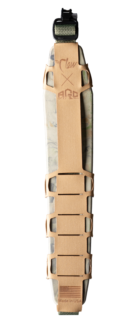 The Claw 2.0 is a modular rifle sling featuring a molded, odor-resistant pad that distributes weight evenly and remains flexible to -40°F without slipping or absorbing water. The laser-cut 500D nylon MOLLE panel accommodates rangefinders, ammo wallets, and other accessories for customizable carry options. Hush Stalker II metal swivels provide quiet, secure connections to standard rifle studs.