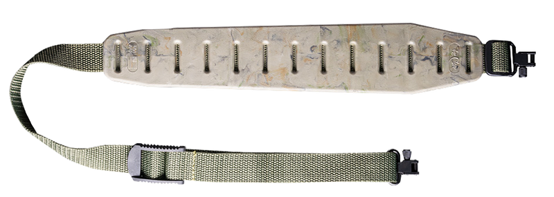 The Quake Claw 2.0 is a 2-point rifle/shotgun sling featuring a molded non-slip pad designed to prevent rolling and tugging while distributing firearm weight across the shoulder. The pad incorporates approximately 1/2 inch of stretch for enhanced comfort and includes Hush Stalker II QD metal sling swivels. The sling is constructed from durable, odor-resistant webbing and is suitable for both rifle and shotgun applications.