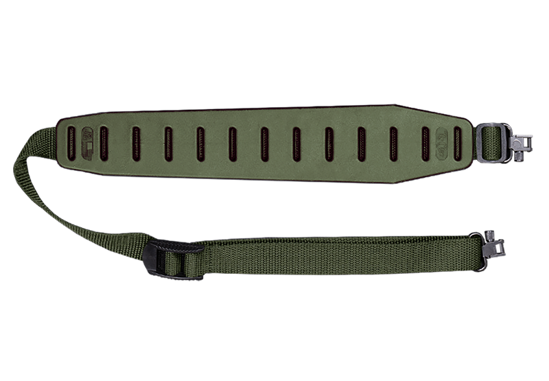 The Quake Claw 2.0 is a 2-point rifle sling featuring a molded non-slip pad integrated into the webbing that provides approximately 1/2 inch of stretch to distribute firearm weight across the shoulder for increased comfort. The sling includes standard Hush Stalker II QD metal swivels and measures 16.9 inches in length with a 2.5-inch width. The durable, odor-resistant pad grips the firearm to prevent tugging, rolling, and shifting during carry.
