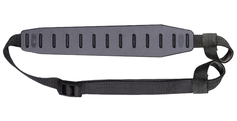 The Claw 2.0 is a 2-point shotgun sling featuring a molded non-slip rubber pad integrated into nylon webbing to prevent slipping and rolling on the shoulder. The sling provides approximately 1/2 inch of stretch to distribute firearm weight across the shoulder for improved comfort during extended use. Dimensions are 16.9 inches in length with 12.6 inches width and 1.1 inches thickness.