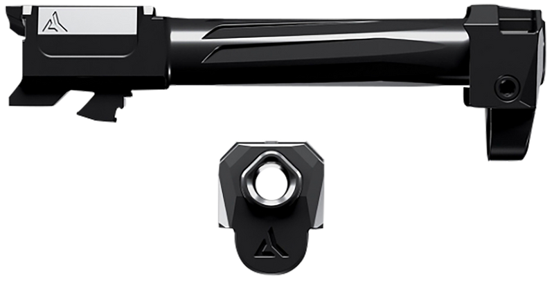 This combo package includes a match-grade Ramjet barrel and Afterburner compensator designed for the Glock 43X in 9mm Luger. Both components are machined from hardened 416R stainless steel with Radianite coating for low friction and high corrosion resistance. The threadless design allows for tool-free installation and removal, and the product is legal for sale in all 50 states.