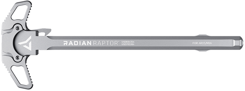 The Radian Raptor is an ambidextrous charging handle designed for mil-spec AR-15 and M16 platforms. Constructed from 7075-T6 aluminum with polymer overmold, it features an NP3 coating for enhanced corrosion resistance and durability. The handle measures 10.1 inches in length with a 3.7-inch width, providing enhanced ergonomics and control.
