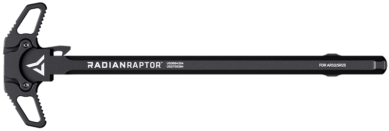 The Radian Raptor is an ambidextrous charging handle designed for AR-10/SR-25 platform rifles in 7.62mm caliber. Constructed from 7075-T6 aluminum with polymer overmold, it measures 10.1 inches in length and features ergonomic design for both left and right-handed shooters. The handle installs on mil-spec upper receivers and provides reliable, consistent charging operation.