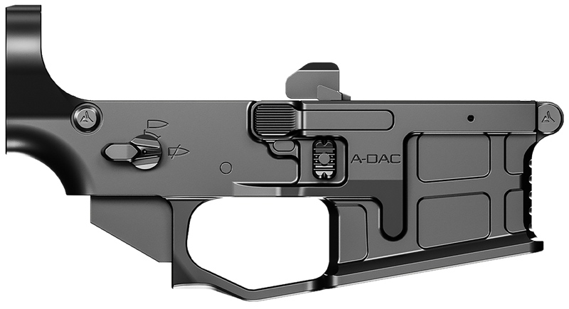 Semi-automatic AR-15 billet lower receiver machined from 7075-T6 aluminum with fully ambidextrous controls. Features the patented A-DAC (Ambidextrous Dual Action Catch) bolt catch, Talon 45/90 ambidextrous safety selector, left-side magazine release, right-side bolt release, and enhanced takedown pins in a Cerakote black finish.