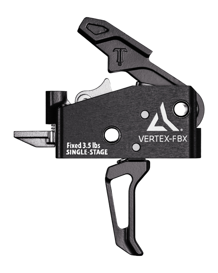 The Radian Weapons Vertex FBX is a single-stage trigger designed for AR-15 platform rifles, featuring a flat trigger bow and black anodized aluminum construction. It has a pull weight of 3.5 lbs and is compatible with standard AR-15 receivers. This trigger installs using standard AR-15 trigger group pins and offers a crisp, reliable trigger break for both shooting sports and tactical applications.