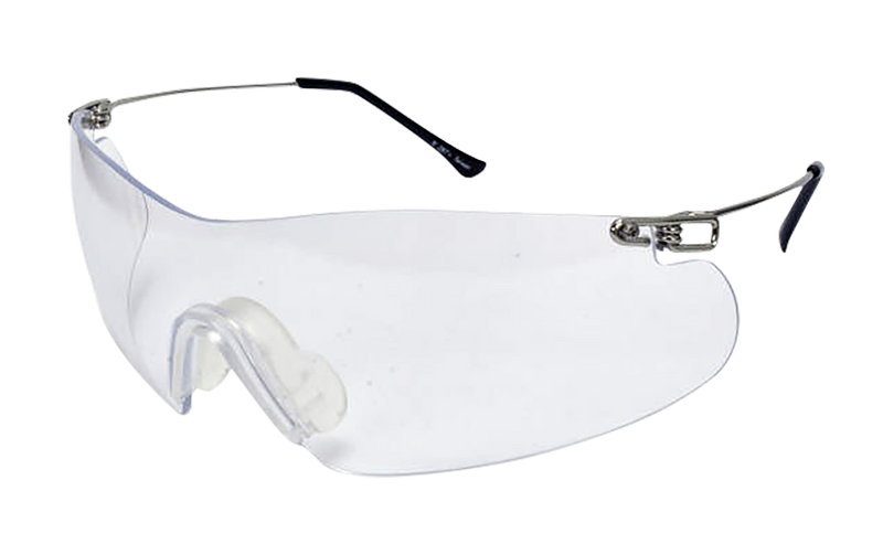 Radians Clay Pro shooting glasses feature wraparound clear lenses with 99.9% UV protection and ANSI Z87.1 certification for reliable eye safety. The silver frame includes a soft rubber nose piece for comfort during extended shooting sessions. Designed specifically for clay shooting and other sporting applications.
