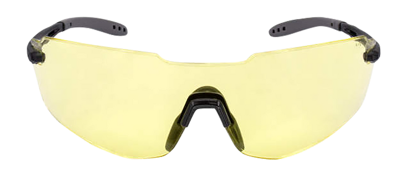 Half-frame safety glasses with amber lens and black frame designed for shooting and outdoor activities. Features 99.9% UV protection and rubber nose piece for secure fit and comfort during extended wear.