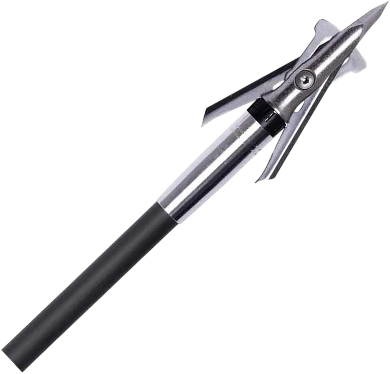 The Rage Hypo 2 +P broadhead features stainless steel construction with a 1.75-inch cutting diameter and 100-grain weight, designed for precision and penetration. The reduced blade angle and triangular shank facilitate effortless penetration with reliable Shock Collar installation. Each 4-pack is built for tough hunting conditions and delivers superior wound channels for ethical kills.