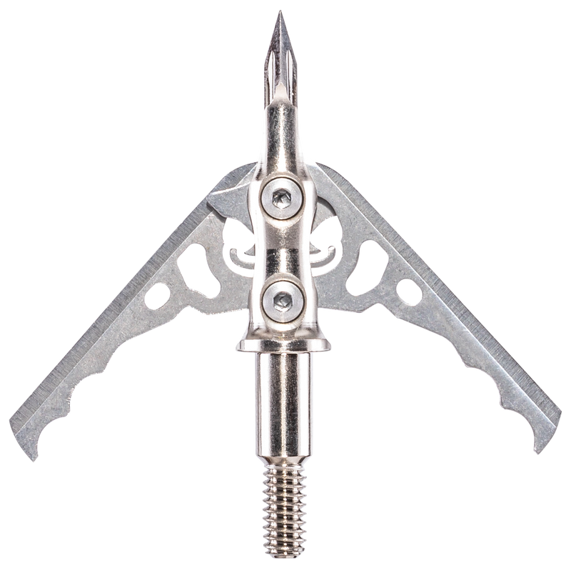 The Rage Hypodermic NC is a 2-blade crossbow broadhead featuring a hybrid hypodermic tip and machined stainless steel ferrule. It utilizes finger-like tabs on the Slip Cam pivot point to anchor blades in the closed position without requiring a shock collar or O-ring, deploying to a 2-inch cutting diameter upon impact.