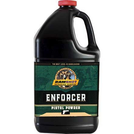 Ramshot Enforcer is a spherical, double-base, smokeless handgun powder designed for large magnum calibers including .357 Magnum, .44 Magnum, .480 Ruger, and .454 Casull, as well as .22 Hornet rifles. The powder delivers high velocities with clean burning characteristics and consistent accuracy across various load weights.