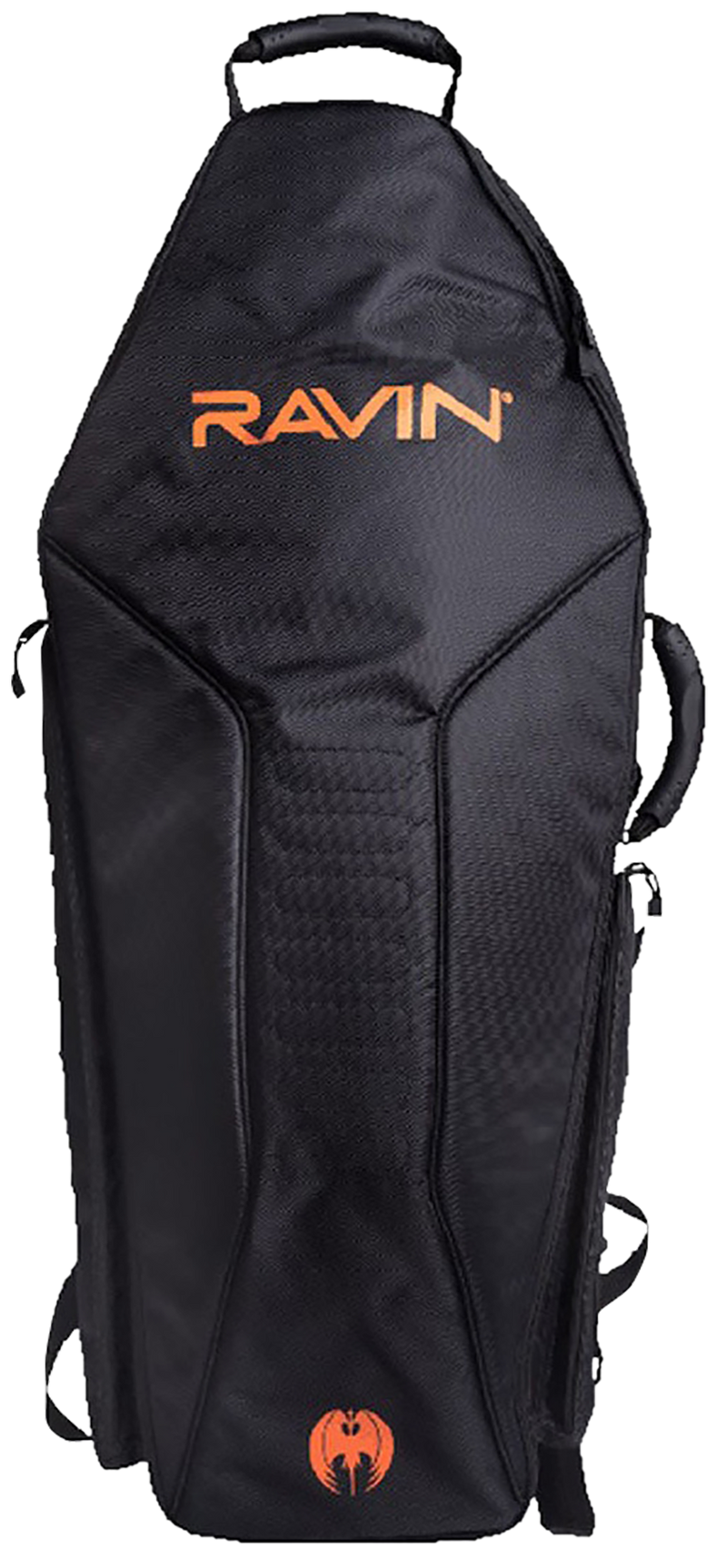 Heavy-duty soft-sided crossbow case designed exclusively for Ravin crossbows with generous padding for transport and damage protection. Features backpack-style strapping, 2 outside zippered pockets, and 2 inside zippered pockets; accommodates fully-assembled crossbow with mounted scope, quiver, and bolts. Dimensions: 35.8" L x 15.2" W x 2.8" H.