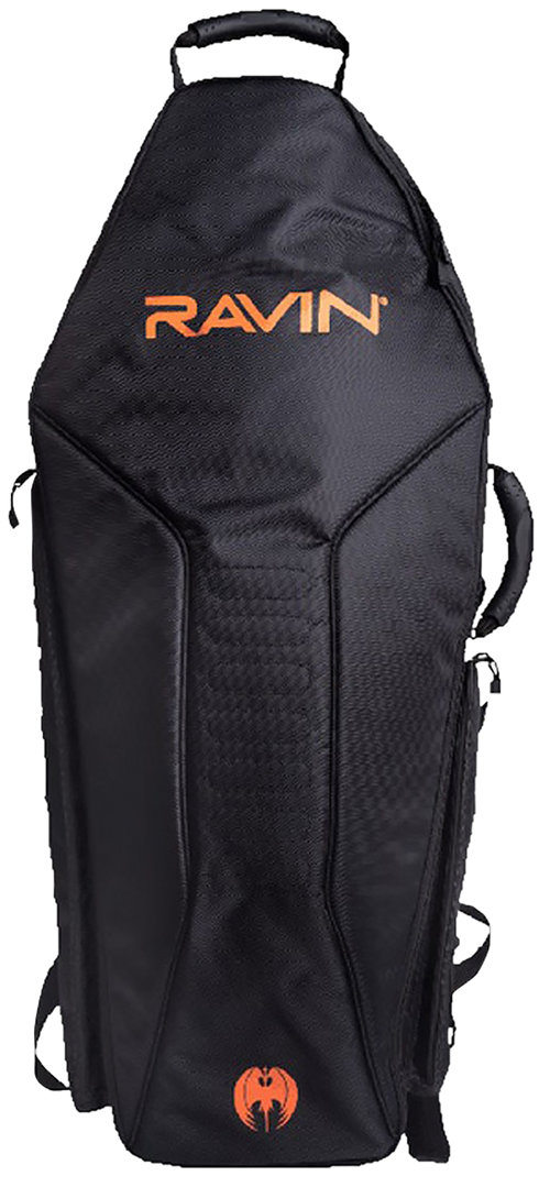 The Ravin R151 is a laser rangefinder designed for crossbow hunters with a maximum range of 1200 yards. This compact rangefinder measures 5.7" x 4.2" x 2.3" and features a black and orange color scheme for visibility in the field.