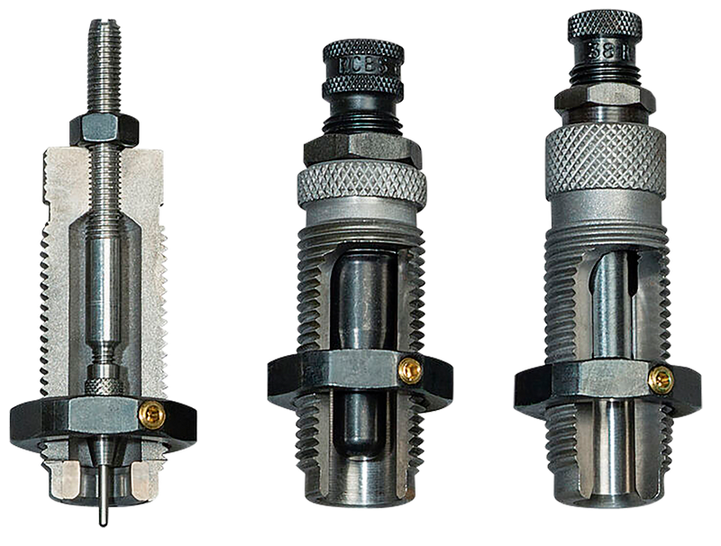 This 3-die roll crimp set is designed for reloading straight-wall rifle cartridges, specifically the 45-70 Government. The set includes a steel sizer die that sizes cases and de-primes, an expander die that expands the case mouth for bullet feeding, and a seater die that seats the bullet and applies roll crimp. Cases must be lubricated during the sizing process.