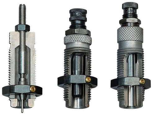 This 3-die roll crimp set is designed for reloading straight-wall rifle cartridges in .458 Lott. The set includes a steel sizer die that sizes cases and removes primers (cases require lubrication), an expander die that prepares case mouths for bullet seating, and a seater die that seats bullets and applies roll crimps. Ideal for precision rifle ammunition handloaders.