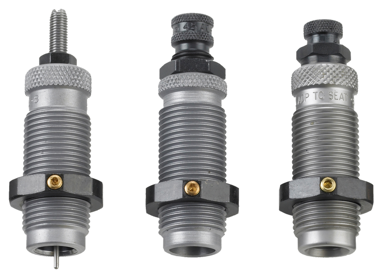 This 3-die carbide set is designed for straight-wall pistol cases in .40 S&W and 10mm Auto. The carbide sizer die sizes and de-primes without requiring case lubrication, the expander die prepares the case mouth for bullet seating, and the seater die seats the bullet and applies a taper crimp. Group B configuration suitable for popular pistol cartridges.