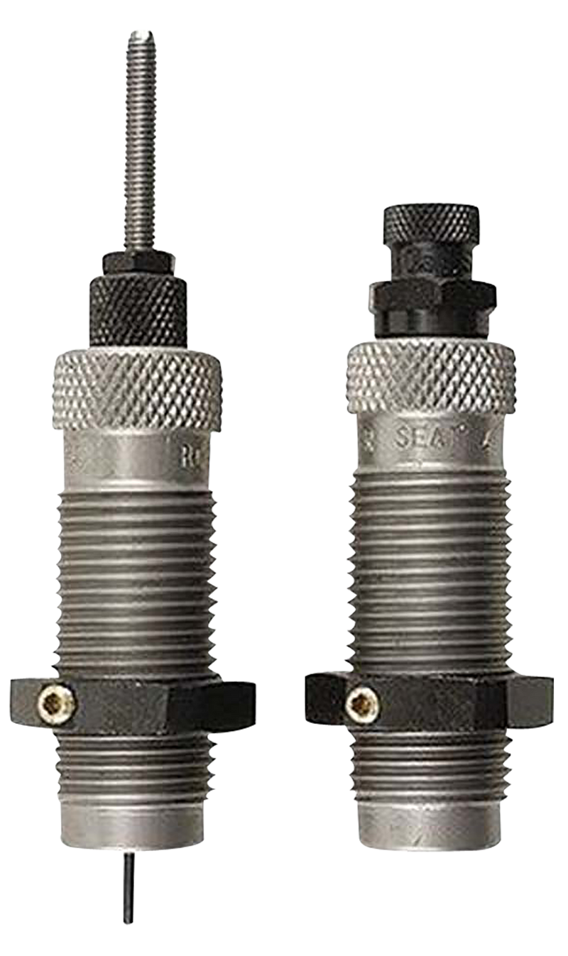 This two-die reloading set consists of a Full-Length Sizer Die with Expander-Decapping Unit and a Seater Die with Bullet Seater Plug, designed for bottleneck rifle cases. The Full-Length Sizer Die brings cases to SAAMI minimum cartridge dimensions, sizes the case exterior, de-primes, and expands the neck to accept bullets, with vents to prevent case damage. Headspace is held to minimum tolerances for precision reloading.