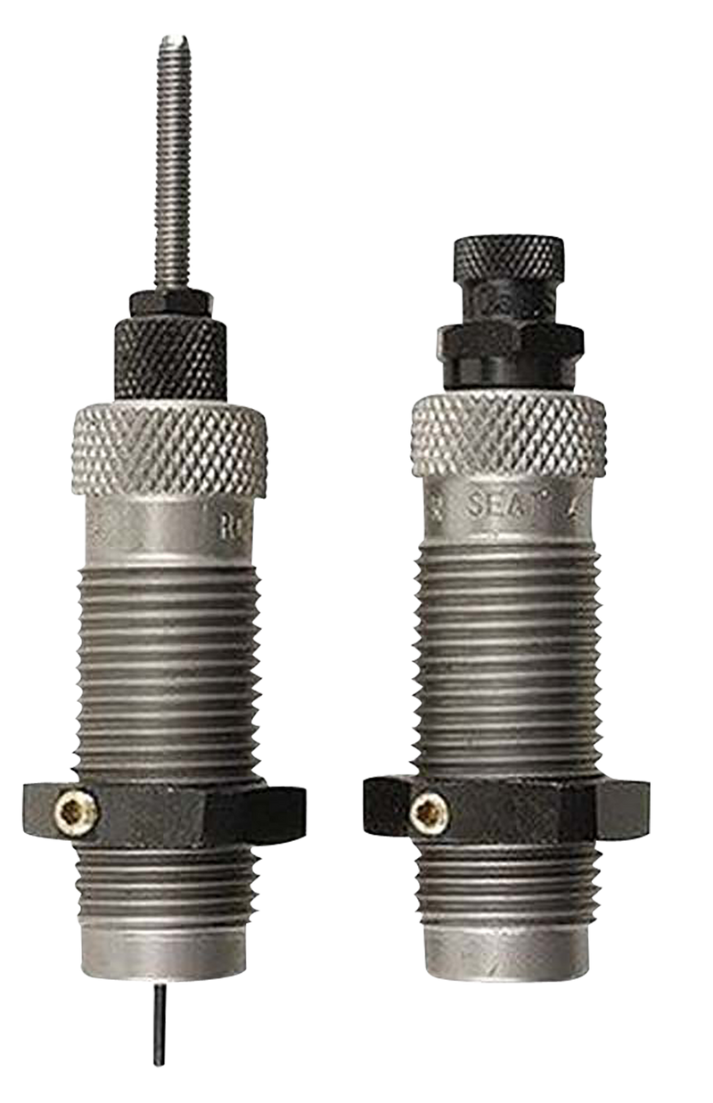 This two-die reloading set for .240 Weatherby Magnum bottleneck rifle cartridges consists of a Full-Length Sizer Die with Expander-Decapping Unit and a Seater Die with Bullet Seater Plug. The Full-Length Sizer Die brings cases to SAAMI minimum dimensions, sizes the case body, de-primes, and expands the neck to accept bullets, with vents to prevent case damage from trapped air or excessive lubricant. Headspace is held to minimum tolerances to avoid changing case body length.