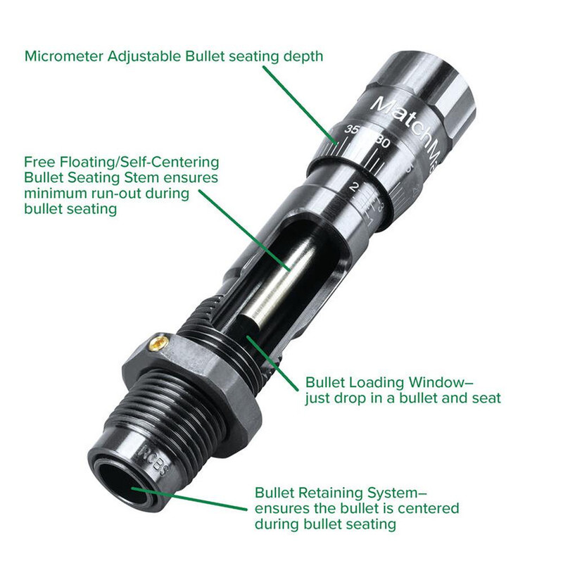 The Matchmaster seating die is precision-engineered for reloading 6mm BR Remington cartridges with case-hardened steel construction and hand-polished internal surfaces for exceptional accuracy. This stand-alone seater die features exacting tolerances and fine fit and finish typical of RCBS's Matchmaster line. Designed for competitive shooters and reloaders seeking premium quality and consistent performance.