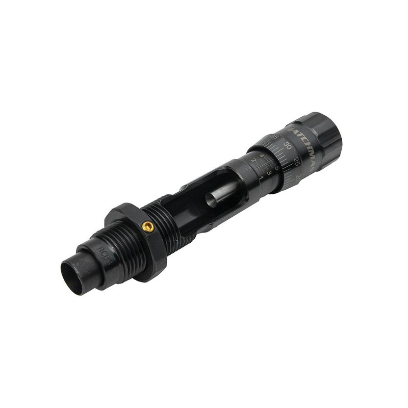 The Matchmaster seater die is a precision reloading component featuring a polished finish with deep blue coating, designed for seating bullets in 300 AAC Blackout cartridges. The oversized adjustment knob with enlarged letters and hash marks allows for precise one-thousandth inch adjustments, and an exclusive loading window enables easy bullet insertion during the pressing process.