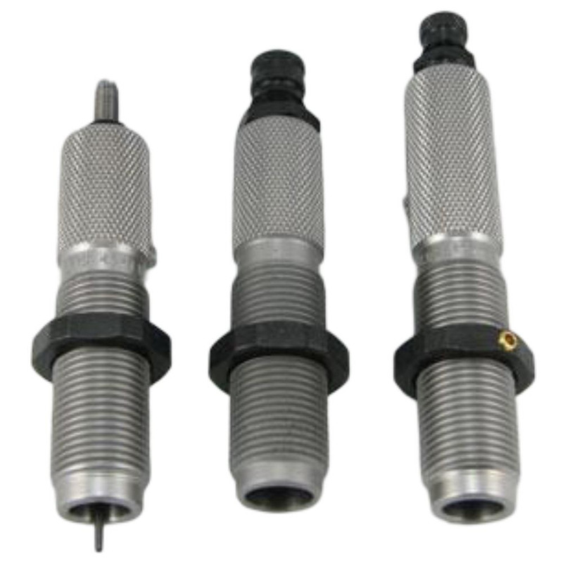 This 3-die roll crimp set is designed for the .500 Jeffery straight-wall cartridge commonly used for dangerous game hunting in Africa. The set includes a steel sizer die that sizes and de-primes cases, an expander die that prepares cases for bullet seating, and a seater die that seats bullets and applies roll crimp. Note: Cases require lubrication and a press adapter bushing (sold separately) is needed due to the 1-inch die body.