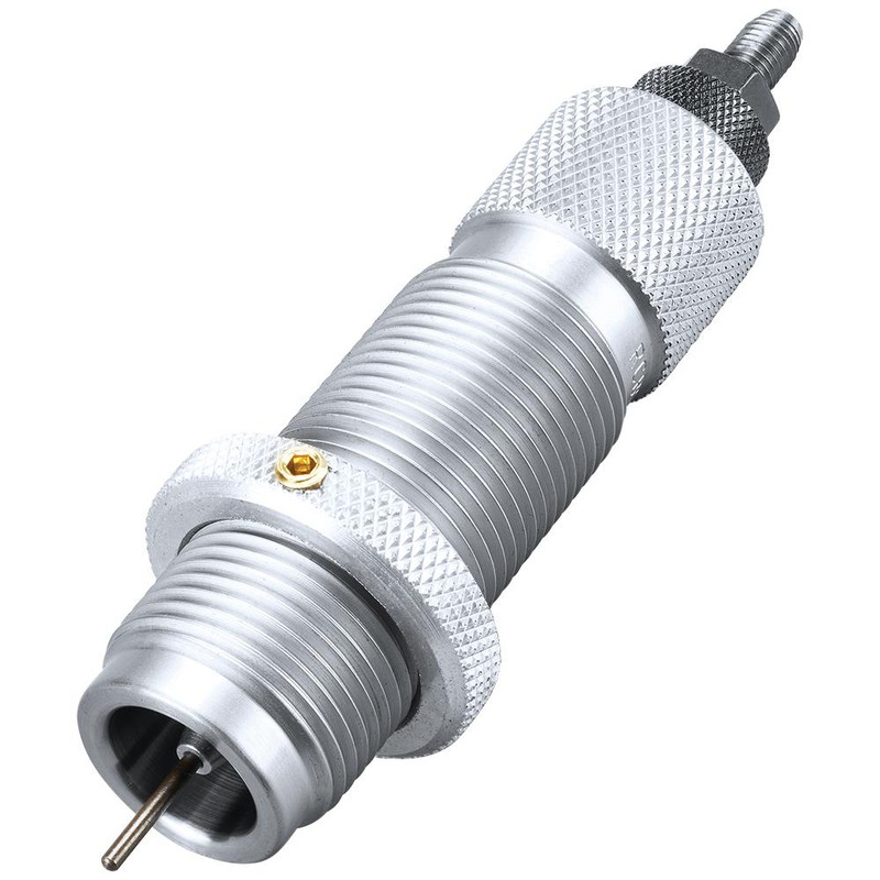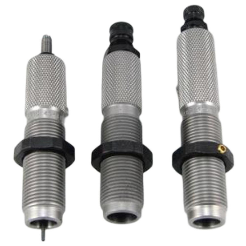 This 3-die roll crimp set is designed for the .505 Gibbs straight-wall cartridge commonly used for dangerous game hunting. The set includes a sizer die that sizes cases and de-primes, an expander die that expands cases to proper diameter and imparts case mouth flare for bullet feeding, and a seater die that seats bullets and applies roll crimp. Cases require lubrication during the sizing process.
