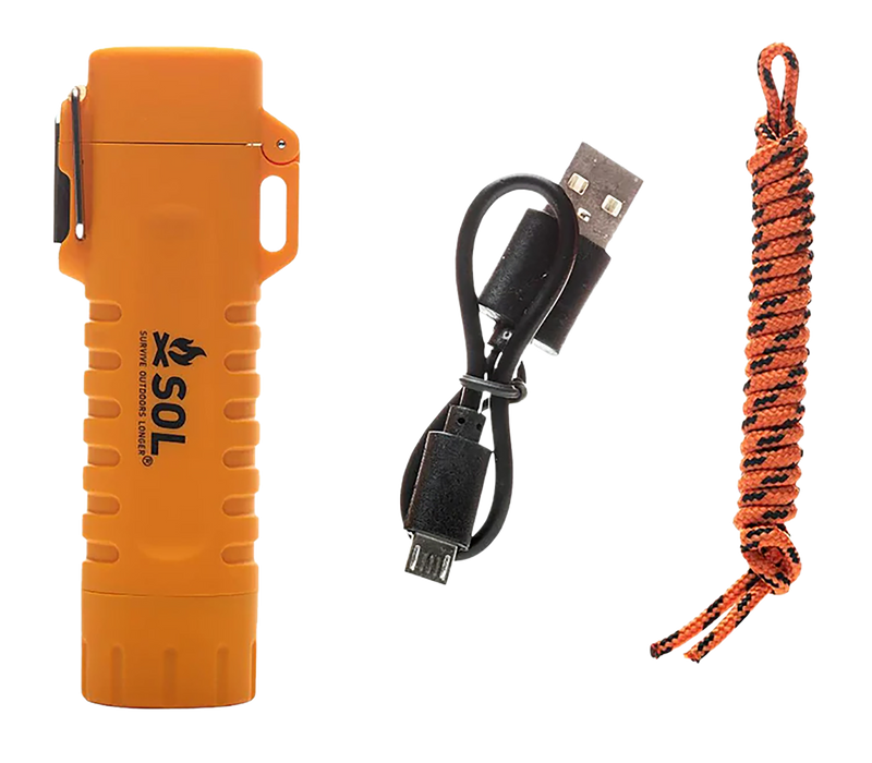 This weatherproof electric plasma lighter features dual top-facing arcs that ignite flammable materials on contact, making it ideal for starting campfires and stoves in any condition and altitude. The USB-rechargeable lighter weighs less than 2 oz and includes a built-in LED light and tinder paracord lanyard. It operates without fuel and is designed for reliable fire starting in emergency and outdoor survival situations.