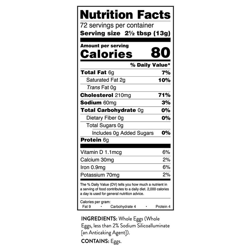 This #10 can contains 72 servings of powdered eggs suitable for any cooking or baking application. The product can be used to prepare omelets, cakes, cookies, pancakes, muffins, French toast, and other dishes. Available for drop-ship delivery with multiple shipping options.